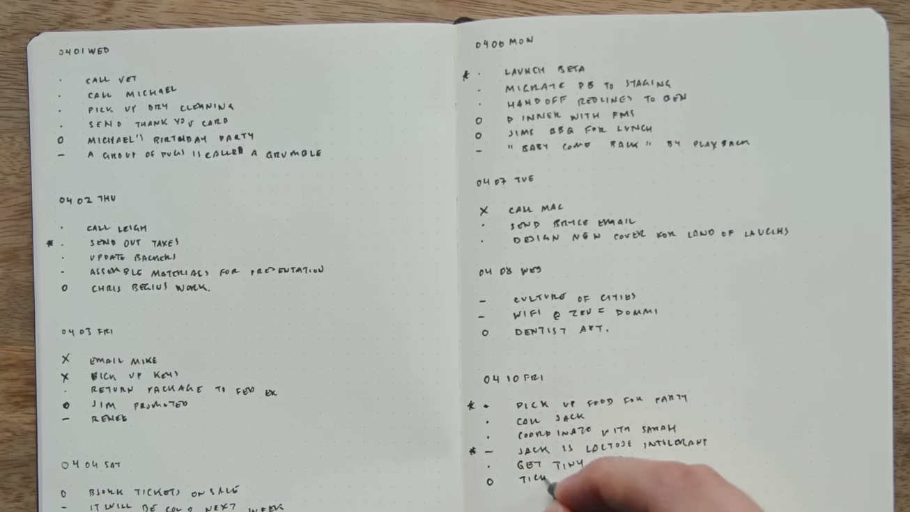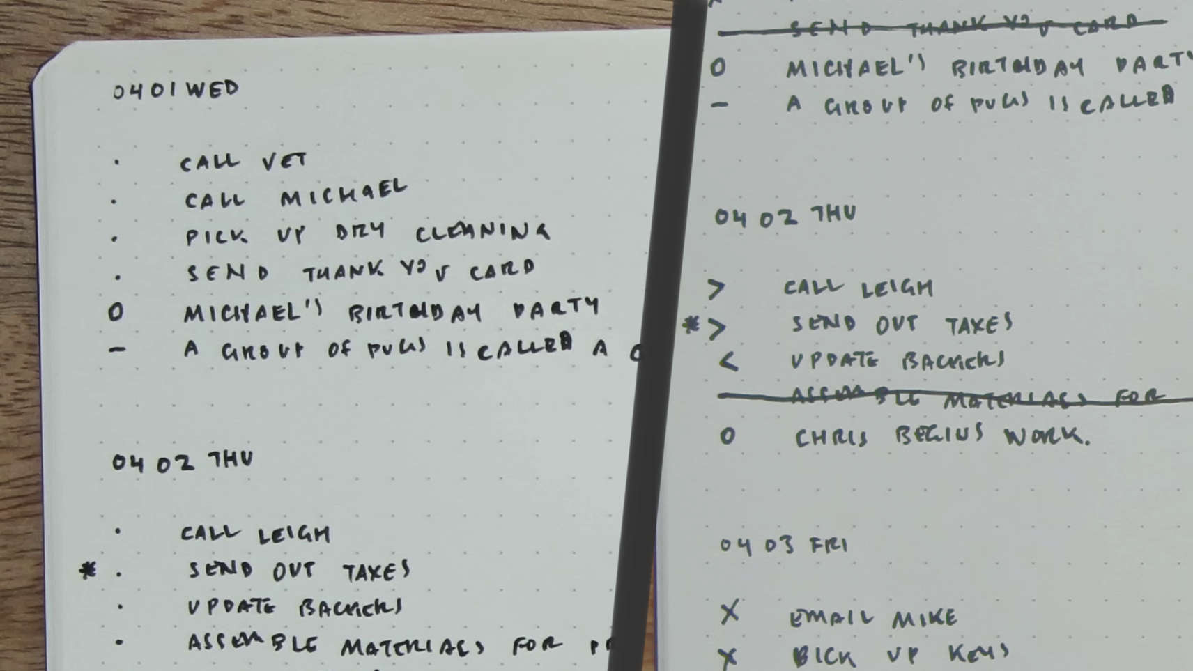 Zjutraj običajno pregledamo nedokončana opravila (hitro jih prepoznamo po žebljičku • ) preteklih dni v mesecu ter mesečni dnevnik. Pričnemo dnevni dnevnik za današnji dan ter nanj preselimo oz. migriramo neopravljena opravila, ki jih želimo danes opraviti (zelo pomembno: to še ne pomeni, da jih dejansko bomo!) in opravila z današnjim datumom. Ko jih preselimo na dnevni dnevnik, prejšnje zapise označimo s puščico > .