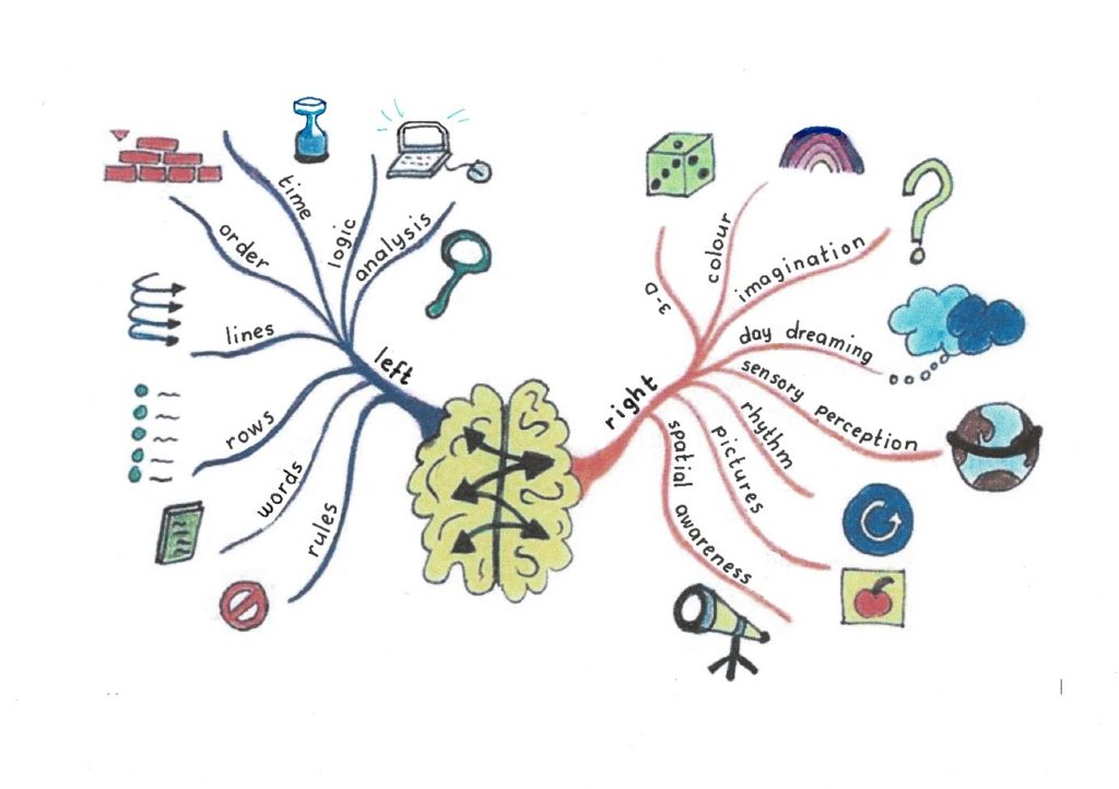 Gotovo ste že slišali, da sta dva glavna dela naših možganov leva in desna polovica. Leva polovica se ukvarja v glavnem z besedami, številkami, seznami, redom, hierarhijo, linearnostjo in logičnim razmišljanjem. Desna polovica se ukvarja z barvami, ritmom, prostorom in dimenzijo, domišlijo ter širšim pogledom na svet.