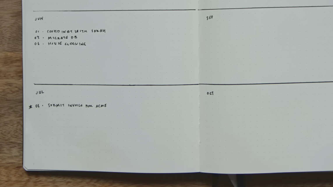 Prvi razpon strani za kazalom posvetite dnevniku prihodnosti. Naslovite ju in obe polovici razdelite na tri dele z vodoravnimi črtami. V vsakega izmed njih napišite ime meseca, pri čemer začnete s prihodnjim mesecem (trenutni mesec bo dobil svoje mesto v mesečnem dnevniku). Sem boste pisali dogodke iz daljne prihodnosti, ki ne spadajo v trenutni mesec. Dnevnik prihodnosti vnesite na kazalo, na primer kot Dnevnik prihodnosti: 5